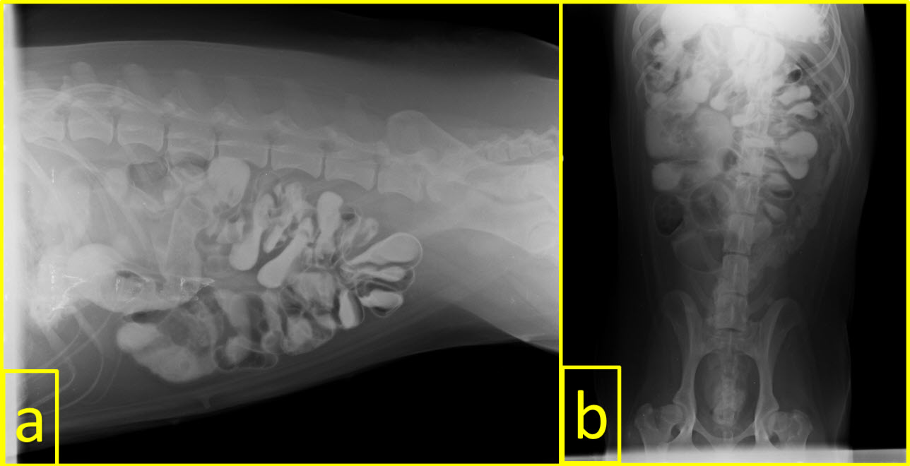 FIGURE 3. Visualization of some of the Foreing Body by direct radiography. a: sewing needle in a cat, b: two erasers in the stomach in a dog, c: metallic object in a dog, and d: two stones in the stomach and large intestine in a dogFIGURE 4. A typical accordion image on indirect radiography due to swallowing of a rope in a dog. a: Latero-Lateral (LL) view and b: Ventro-Dorsal (VD) view