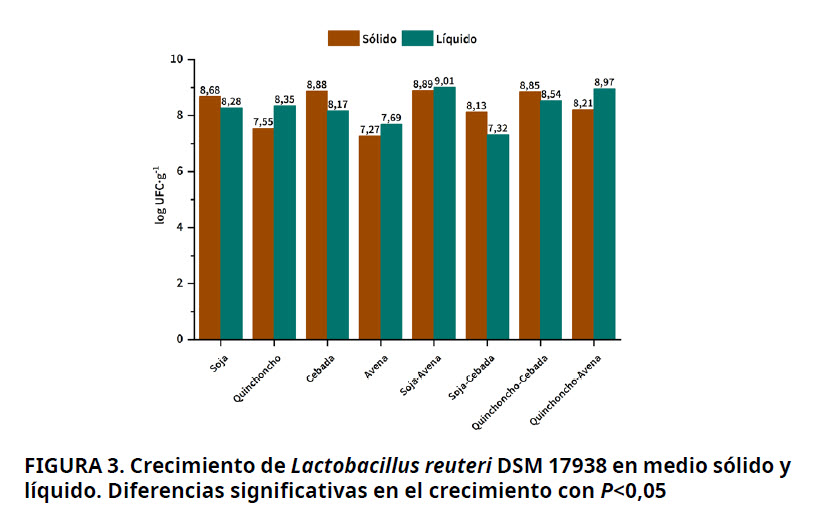 Los efectos beneficiosos de los microorganismos probióticos cuando se ingieren en cantidad suficiente tienen una influencia positiva para la salud de los seres humanos y animales. Los probióticos, especialmente los Lactobacilos, pueden inhibir el crecimiento de patógenos y mejorar la inmunología y las funciones metabólicas del hospedador. Las cepas de Lactobacillus reuteri son habitantes comunes del intestino de los mamíferos y exhiben propiedades que promueven la salud. Por esta razón, el objetivo de este trabajo fue determinar el efecto de diferentes formulaciones preparadas con cereales y leguminosas sobre el crecimiento de L. reuteri DSM 17938. Para esto, en el presente trabajo, sustratos solos o mezclas de cereales y leguminosas fueron fermentados con L. reuteri DSM 17938 para estudiar y comparar el efecto de la formulación de los medios sobre su crecimiento. Los medios se formularon utilizando dos harinas de cereales y dos de leguminosas: cebada, avena, quinchoncho y soja y mezclas de cereales y leguminosas (soja– avena, cebada–soja, quinchoncho–avena y quinchoncho–cebada). Se prepararon dos tratamientos un medio sólido (T1) y otro medio líquido (T2). Los resultados mostraron que hubo diferencias significativas (P<0,05) en el crecimiento de L. reuteri entre los medios de cereales y leguminosas y sus mezclas. No hubo diferencias significativas (P>0,05) entre los medios sólidos y líquido. El medio de cebada (8,87 log UFC·g-1) soportó significativamente mejor crecimiento en comparación con los medios de avena, soja y quinchoncho. La población de células de L. reuteri en los medios con mezclas de cereales y leguminosas varió de 9,01 a 7,32 log UFC·g-1. La combinación de soja y avena fue la más eficiente en mantener la viabilidad. Los valores de pH estuvieron entre 4 y 5.