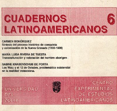 Vol. 3 No. 6 (1991)El sexto número de la Revista Cuadernos Latinoamericanos del Centro Experimental de Estudios Latinoamericanos (CEELA) se publicó en diciembre de 1991 por la Editorial de la Universidad del Zulia (EDILUZ). Este número presenta tres trabajos: Síntesis del proceso histórico de conquista y colonización de la Nueva Granada (1500-1800) de Carmen Bohórquez (Universidad del Zulia, Maracaibo-Venezuela); Transculturación y valoración del hombre aborigen de María Luisa Rivara de Tuesta (Universidad Nacional Mayor de San Marcos, Lima-Perú) y Los Waiu y el 12 de octubre. Problemática existencial en la realidad venezolana de Sabine Knabenschub de Porta (Universidad del Zulia, Maracaibo-Venezuela).