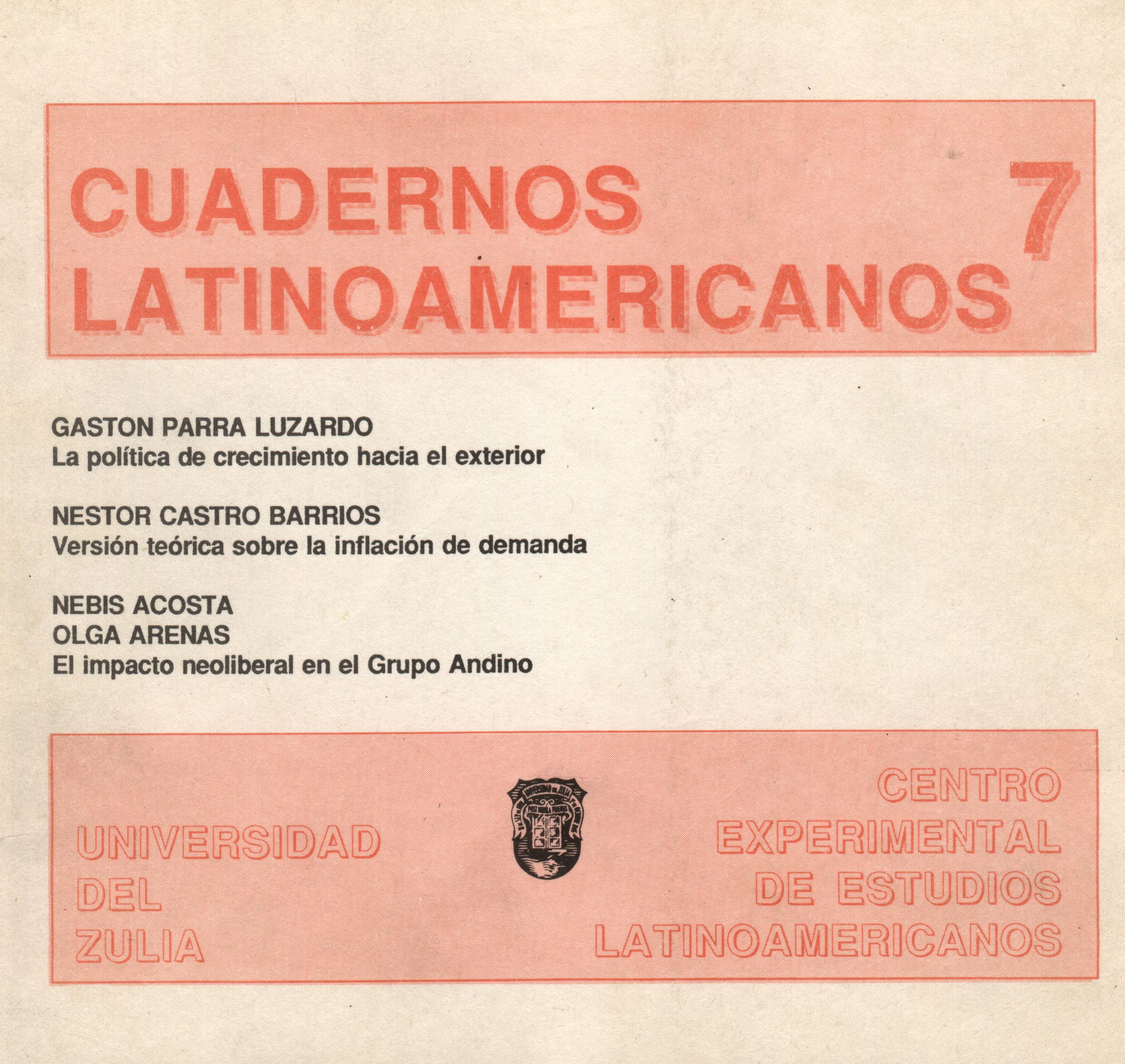 Vol. 4 No. 7 (1992)El séptimo número de la Revista Cuadernos Latinoamericanos del Centro Experimental de Estudios Latinoamericanos (CEELA) se publicó en diciembre de 1992 por la Editorial de la Universidad del Zulia (EDILUZ). Este número presenta tres trabajos de profesores e investigadores de la Universidad del Zulia: La política de crecimiento hacia el exterior de Gastón Parra Luzardo; Versión teórica sobre inflación de demanda de Néstor Castro Barrios y El impacto neoliberal en el Grupo Andino de Nebis Acosta y Olga Arenas.