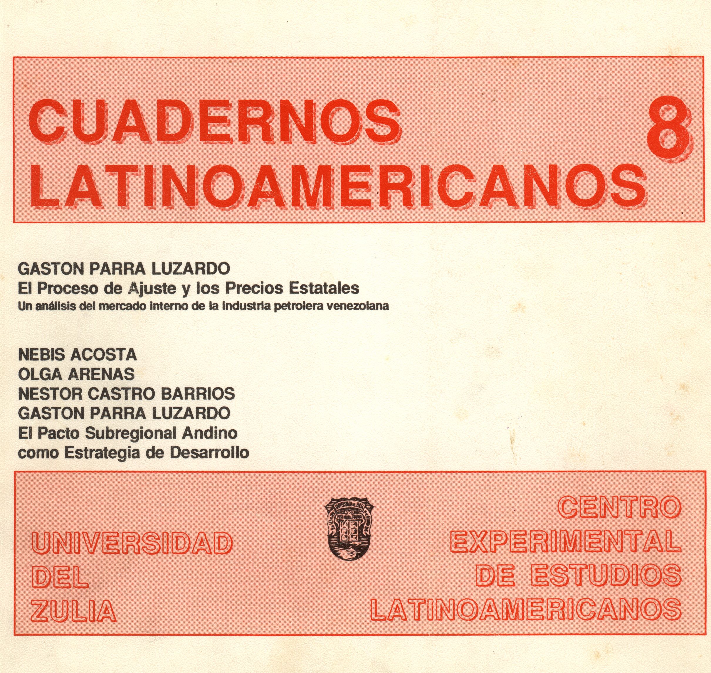 Vol. 4 No. 8 (1993)El octavo número de la Revista Cuadernos Latinoamericanos del Centro Experimental de Estudios Latinoamericanos (CEELA) se publicó en mayo de 1993 por la Editorial de la Universidad del Zulia (EDILUZ). Este número presenta dos trabajos de profesores e investigadores de la Universidad del Zulia: El proceso de ajuste y los precios estatales. Un análisis del mercado interno de la industria petrolera venezolana de Gastón Parra Luzardo y El Pacto Subregional Andino como estrategia de desarrollo de Nebis Acosta, Olga Arenas, Néstor Castro Barrios y Gastón Parra Luzardo.
