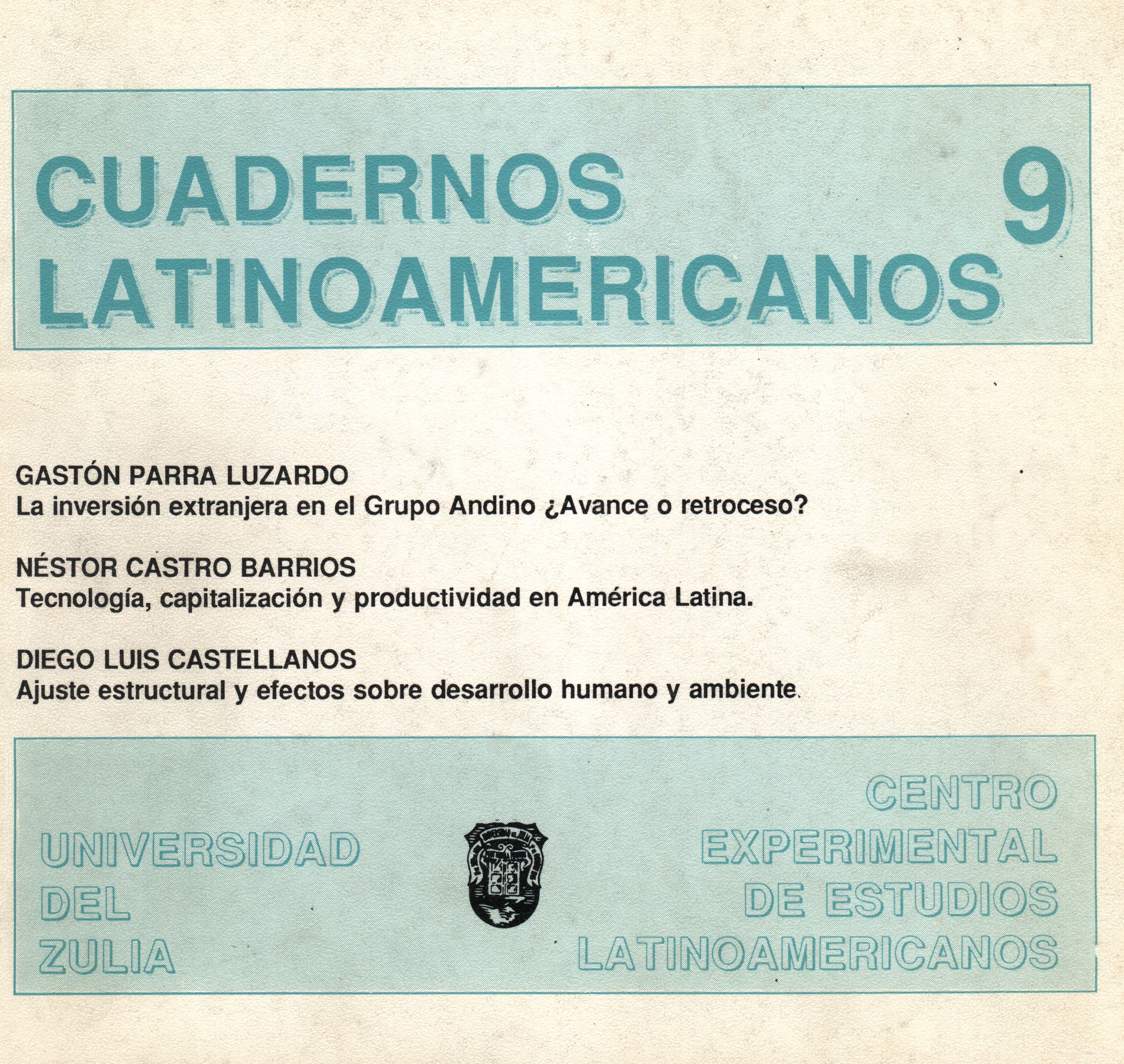 Vol. 5 No. 9 (1994)El noveno número de la Revista Cuadernos Latinoamericanos del Centro Experimental de Estudios Latinoamericanos (CEELA) se publicó en marzo de 1994 por la Editorial de la Universidad del Zulia (EDILUZ). Este número presenta tres trabajos: La inversión extranjera en el Grupo Andino ¿Avance o retroceso? de Gastón Parra Luzardo (LUZ); Tecnología, capitalización y productividad en América Latina de Néstor Castro Barrios (LUZ) y Ajuste estructural y efecto sobre desarrollo humano y ambiente de Diego Luis Castellanos (UCV).