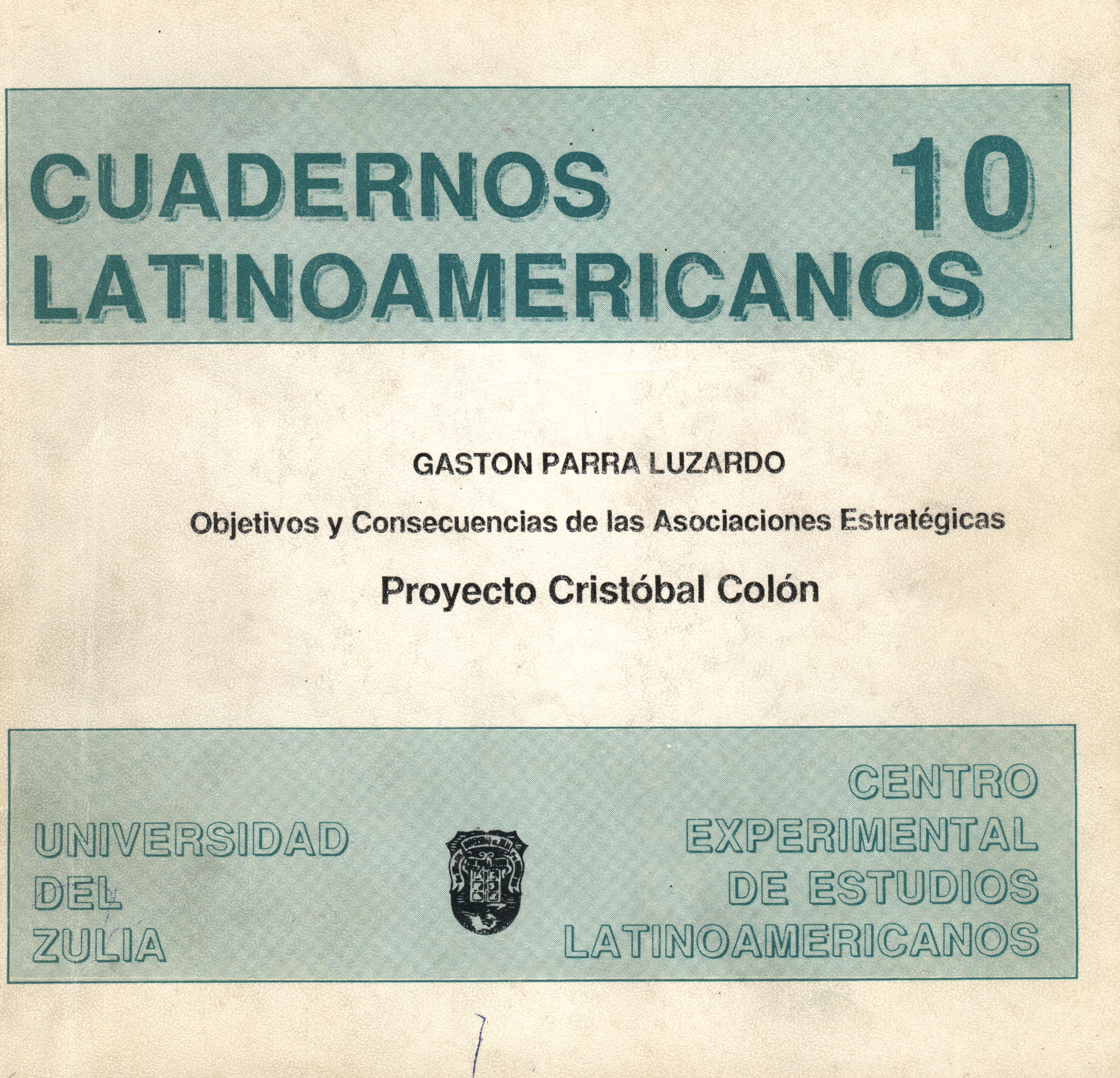 Vol. 5 No. 10 (1994)La Revista Cuadernos Latinoamericanos del Centro Experimental de Estudios Latinoamericanos (CEELA), publicó su número diez en junio de 1994 por la Editorial de la Universidad del Zulia (EDILUZ). Este número presenta el trabajo titulado: Objetivos y consecuencias de las asociaciones estratégicas. Proyecto Cristóbal Colón del profesor-investigador Gastón Parra Luzardo de la Universidad del Zulia (LUZ).