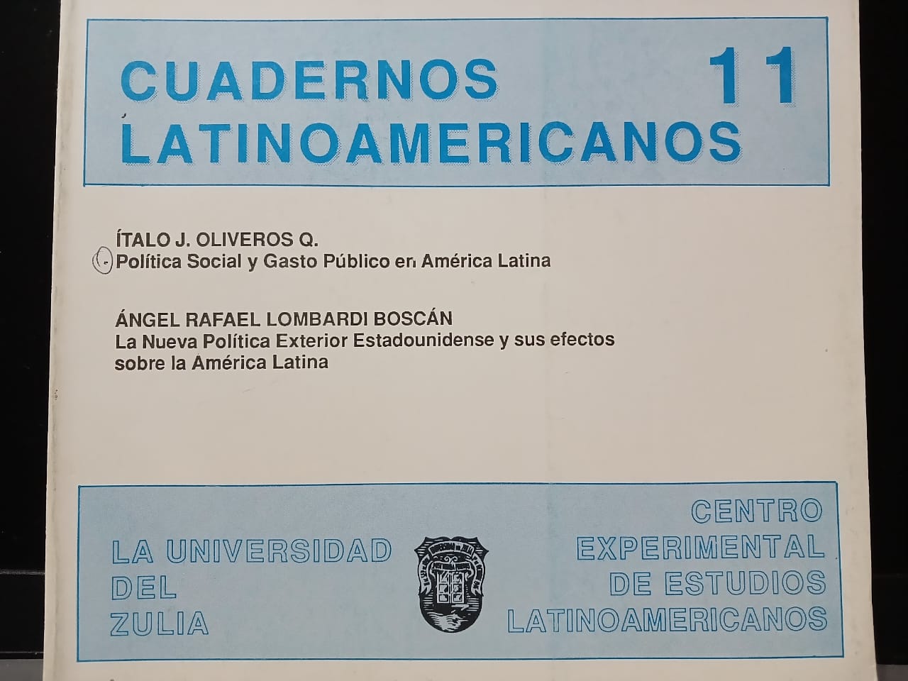 Vol. 6 No. 11 (1995)La Revista Cuadernos Latinoamericanos del Centro Experimental de Estudios Latinoamericanos (CEELA), publicó su número once en junio de 1995 por la Editorial de la Universidad del Zulia (EDILUZ). Este número presenta dos trabajos de profesores-investigadores de la Universidad del Zulia (LUZ) titulados: Política social y gasto público en América Latina de Ítalo Oliveros y La nueva política exterior estadounidense y sus efectos sobre América Latina de Ángel Rafael Lombardi Boscán.
