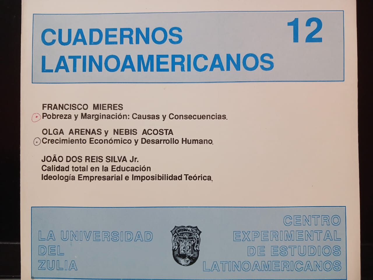 Vol. 7 No. 12 (1995)La Revista Cuadernos Latinoamericanos del Centro Experimental de Estudios Latinoamericanos (CEELA), publicó su número doce en marzo de 1996 por la Editorial de la Universidad del Zulia (EDILUZ). Este número presenta tres trabajos: Pobreza y marginación: causas y consecuencias de Francisco Mieres (Universidad Central de Venezuela, UCV, Venezuela); Crecimiento económico y desarrollo humano de Olga Arenas y Nebis Acosta (Universidad del Zulia, LUZ, Venezuela) y Calidad total en la educación. Ideología empresarial e imposibilidad teórica de Joao Dos Reis Silva Jr. (Universidad Metodista de Piracicaba, UNIMEP, Brasil).