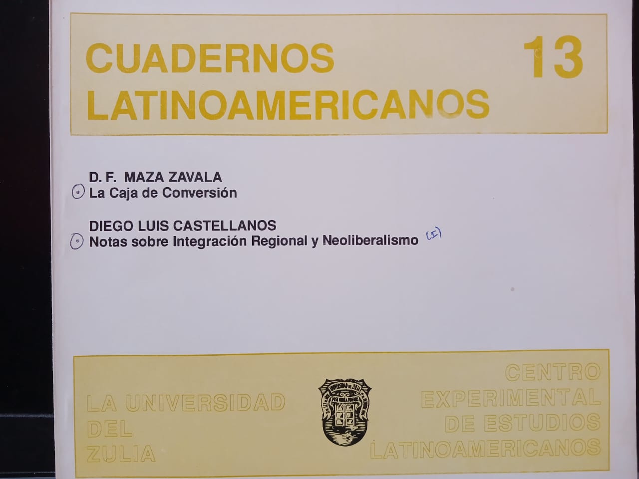 Vol. 8 No. 13 (1996)La Revista Cuadernos Latinoamericanos del Centro Experimental de Estudios Latinoamericanos (CEELA), publicó su número doce en marzo de 1996 por la Editorial de la Universidad del Zulia (EDILUZ). Este número presenta dos trabajos de profesores e investigadores de la Universidad Central de Venezuela (UCV) y funcionarios del Banco Central de Venezuela (BCV): La caja de conversión de Domingo Felipe Maza Zavala y Notas sobre integración regional y neoliberalismo de Diego Luis Castellanos