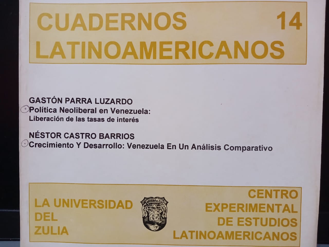 Vol. 8 No. 14 (1996)La Revista Cuadernos Latinoamericanos del Centro Experimental de Estudios Latinoamericanos (CEELA), publicó su número catorce en noviembre de 1996 por la Editorial de la Universidad del Zulia (EDILUZ). Este número presenta dos trabajos de profesores e investigadores de la Universidad del Zulia (LUZ, Venezuela): Política neoliberal en Venezuela: liberación de las tasas de interés de Gastón Parra Luzardo y Crecimiento y desarrollo: Venezuela en un análisis comparativo de Néstor Castro Barrios.
