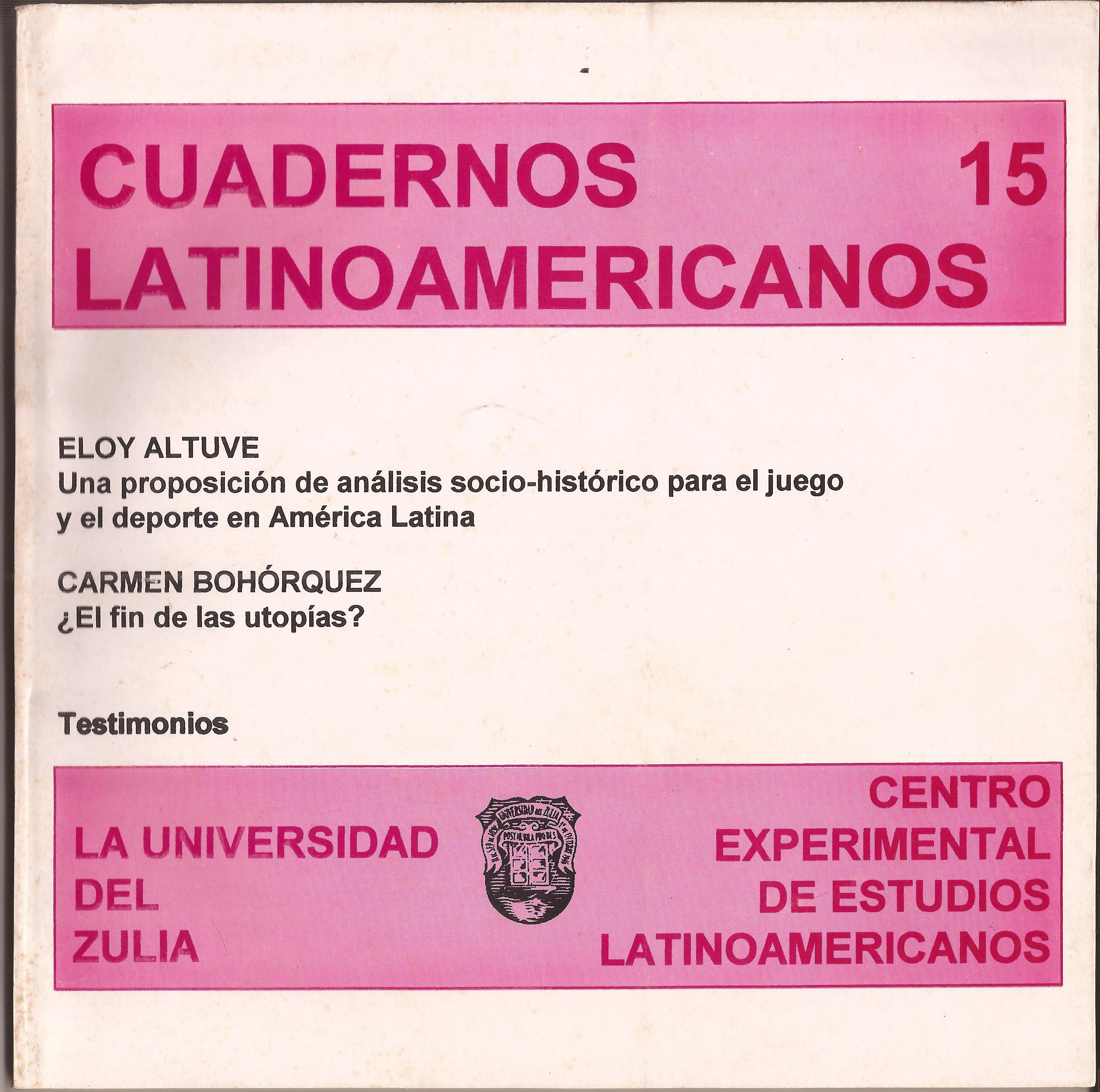 Vol. 9 No. 15 (1997)El número quince de la Revista Cuadernos Latinoamericanos del Centro Experimental de Estudios Latinoamericanos (CEELA) fue publicada en junio de 1997 por la Editorial de la Universidad del Zulia (EDILUZ). Este número presenta dos trabajos de profesores de la Universidad del Zulia (LUZ, Venezuela): Una proposición de análisis socio-histórico para el juego y el deporte en América Latina de Eloy Altuve y ¿El fin de las utopías? de Carmen Bohórquez. Adicionalmente, se presentan diversos testimonios en relación a la Consolidación del CEELA, por sus 12 años de creación.
