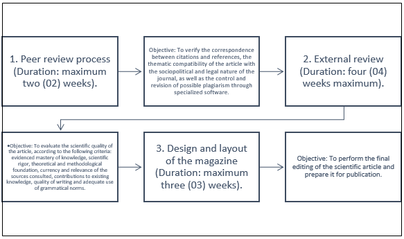 Mas específicamente el objetivo de la fase 1, es verificar la correspondencia entre citas y referencias, la compatibilidad temática del artículo con la naturaleza sociopolítica y jurídica de la revista, así como el control y revisión de posibles plagios a través de softwares especializados. Por último, también se verifica que el texto no haya sido producido, de forma parcial o total, por alguna forma de Inteligencia Artificial IA, con la herramienta: https://www.duplichecker.com/ai-content-detector.php