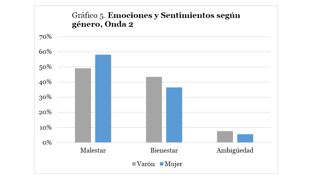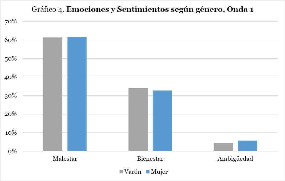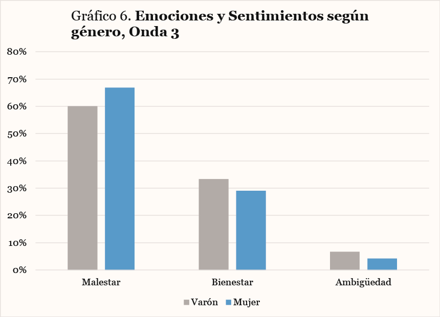 Se advierte una variabilidad en la distribución de las categorías entre géneros; las diferencias se acentúan con el paso de las ondas. La diferencia para la categoría malestar, pasa de valores en paridad entre géneros en la onda 1 (Gráfico 2) a tener una diferencia en la onda 3 en la que las mujeres tienen casi 7 puntos más que los hombres (Gráfico 4). Inversamente, las mujeres tienen menores valores en la categoría bienestar en las tres ondas. La mayor diferencia se registra en la onda 2 en donde los hombres tienen 7 puntos más que las mujeres. La categoría ambigüedad tiene valores inferiores al 7.5% en todo el período de estudio; las emociones y sentimientos de los hombres presentan valores superiores a los de las mujeres para los tres períodos.