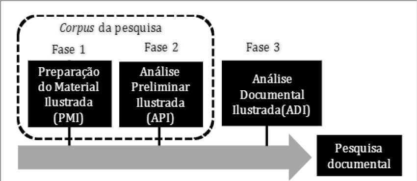 A Fase 1, Preparação do Material Ilustrada (PMI), foi conduzida por meio de nove etapas: (1) reconhecimento das fontes potenciais de informação, (2) estabelecimento de critérios de busca, (3) classificação de documentos, (4) refinamento da consulta de forma densa, (5) flexibilização, (6) localização dos textos, (7) avaliação da credibilidade das fontes, (8) avaliação da representatividade e (9) compreensão e entendimento do sentido das mensagens. Ao seguir para Fase 2, Análise Preliminar Ilustrada (API), foi considerado, inicialmente, o (1) contexto, (2) autores, (3) autenticidade e confiabilidade das mensagens, (4) natureza da fonte e (5) conceitos-chave e lógica interna. Na Fase 3, a última, Análise Documental Ilustrada (ADI), tivemos a análise de cunho interpretativo na interlocução entre o corpus da pesquisa, o aporte teórico e objeto de investigação para (1) menção dos fatos, (2) intepretação das mensagens, (3) sintetização das informações, (4) tendência da síntese das mensagens, (5) inferências dos resultados, (6) articulação teórica para compreensão do fenômeno investigado.
