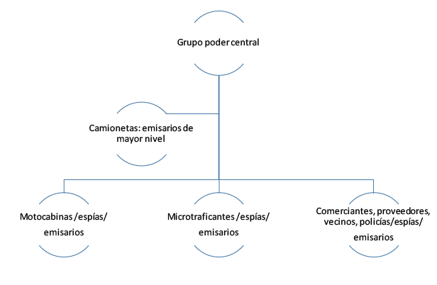 La dinámica espacial del delito mostró que era posible hacer una lectura general de la actividad criminal alrededor de un centro organizado de poder que vigila la vida de los habitantes. Esto indica un particular celo por parte de un emprendimiento delictivo en controlar su zona circundante, estableciendo quién entra, con quién se habla, qué se busca, atemorizar a quienes hablan con los foráneos, o desviar la atención de los foráneos mintiendo o guardando silencio. También se decide la actividad de la policía de la Unidad de Policía Comunitaria local: dónde investiga, quién o qué pregunta, cuando deben desproteger un punto, etc. No se muestra complicidad expresa de la policía, pero si claramente un comportamiento amedrentado y obediente al poder central. A continuación, se muestra la estructura de vigilancia para-estatal. Estructuras similares pueden encontrarse en las organizaciones intracarcelarias y en otros grupos delincuenciales (Dudley y Bargent, 2017).