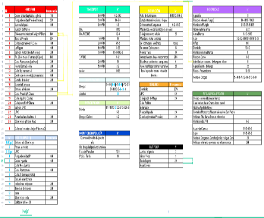 En un primer lugar se detectó la presencia de al menos 24 hotspots, cada uno de estos con sus variables tales como: hostilidad (no hay presencia contrastable de peligrosidad, pero constituye los espacios que se oponen a la percepción de convivencia y seguridad), modalidad delictiva (tipo penal o manera cómo se desarrolló un delito), timespots (periodo de cometimiento del delito, por patrones temporales), disparadores del delito (elementos asociables al delito, como droga, alcohol o armas), percepción y sentimiento de inseguridad, situación delictiva (contexto factorial en el que se produce cada delito y se da sentido a la oportunidad delictiva), inteligencia comunitaria para la prevención, lugares percibidos seguros (lo contrario al hotspot), mapas antípodas (narrativas a contracorriente de la narrativa predominante de la comunidad, incluso falseando abiertamente la información observable, lo cual puede indicar complicidad), monitoreo policial (eficiencia ponderable y complicidad de la policía con el delito) y alteridad (migrantes, perifereidades del barrio, nacionalidades, grupos conspicuos constituidos, etc.). Todas las categorías se producen etnográficamente a partir de del discurso y observación de las mismas víctimas y testigos, y se rechaza cualquier consideración hipotética previa a las evidencias del campo, salvo un primer patrón temático que puede cambiar (y normalmente cambia).