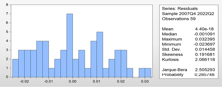 Por otra parte, en las figuras 4 - 5 y la tabla 6, que corresponden a las pruebas de los residuos del vector cointegración para cumplir con los supuestos de Gauss-Markov de autocorrelación (correlograma de los residuos al cuadrado), normalidad y multicolinealidad (Factor de Inflación de la Varianza), -la heterocedasticidad no aplica en este caso porque el método empleado es el de Mínimos cuadrados dinámicos (DOLS), puede confirmarse que dicho modelo cumple con todos los supuestos ya que en el caso de los correlogramas, todas las correlaciones de los residuos se encuentran dentro de los límites de tolerancia, y la probabilidad de prueba de normalidad prob. > 0,05, con lo cual se rechaza la hipótesis nula de no presencia de una distribución normal de los residuos. En cuanto a la prueba de multicolinealidad, los FIV (Factores de inflación de la varianza) <10 indican baja autocorrelación entre las variables independientes del vector de cointegración.