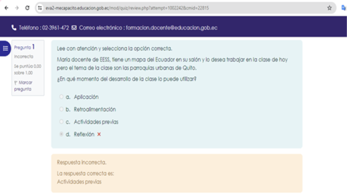Por otro lado, otra entrevistada menciona que los cursos de la plataforma del MINEDUC carecen de efectividad. La licenciada señala algunos aspectos de la manera inadecuada del sistema de evaluación de los cursos: 1) No existen parámetros que exijan al docente a leer la bibliografía. 2) El sistema de evaluación está en todos los cursos, designando varias oportunidades para responder las preguntas, y más allá de esto, al responder mal las preguntas, el sistema arroja inmediatamente la respuesta correcta, entonces, ya es cuestión de volver a llenar el cuestionario con las repuestas indicadas en la revisión de los errores, por ello para su parecer carece de efectividad el sistema de evaluación (ver gráfico N°3). La docente también rescata la importancia de la presencialidad, porque le permite tomar las riendas del proceso en el aula, por ejemplo, realizaban trabajos en grupo, exposiciones, llevaban tareas para la siguiente jornada y les facilitaba el Ministerio material que luego les servía en su desempeño como docente.