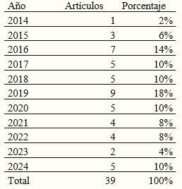 Por otra parte, el análisis permitió establecer que los años con mayor porcentaje en la muestra son 2016 y 2019, con el 18% y 14% en cada caso, seguidos de 2017, 2018, 2020 y 2024 cada uno con 10%. Los años con menor porcentaje dentro de la muestra son 2014 con el 2% y 2023 con 4%. En cuanto al país con mayor número de publicaciones destaca Argentina con el 38%, seguido de Colombia con el 20% y México con el 18%.