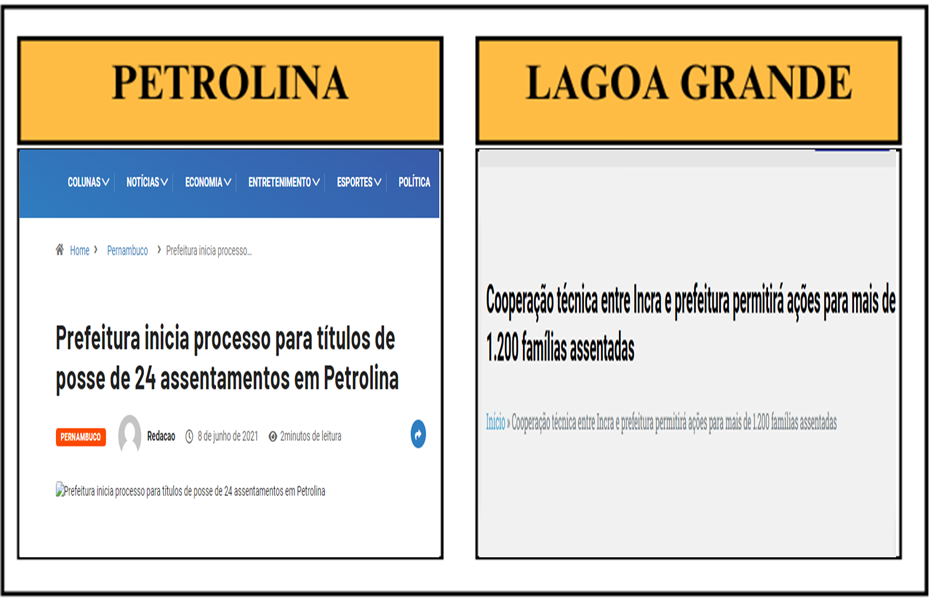 Nesse sentido, conforme site de noticia local - PE News (2021), menciona que a Prefeitura de Petrolina, por meio da cooperação técnica com Instituto Nacional de Colonização e Reforma Agrária (INCRA), pretende alcançar todos os assentamentos existentes no município, destacando os 2 (dois) primeiros que iniciaram o processo para receber os Títulos definitivos como é o caso da Terra da Liberdade e São Francisco. Do mesmo modo, no município vizinho, em nota, Prefeitura de Lagoa Grande (2023), dá ênfase ao acordo de cooperação técnica firmado com o INCRA, permitindo a entrega dos Títulos de Domínios presentes.