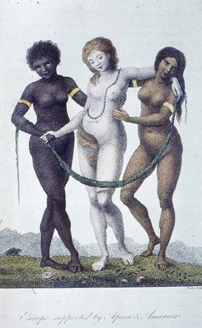 Probablemente el grabado del poeta y pintor inglés William Blake (1796) ilustra la Europa del siglo xviii, porque, con su estilo romántico y taciturno, representa África, mujer negra de curvas redondeadas que con gesto firme sostiene, junto con la trigueña indígena que simboliza a América, a la muchacha de cabellos rubios y carnes flexibles, la rosada Europa. Tal vez la metáfora del artista da cuenta de la invalidez de Europa para sostenerse por sí misma; la figura tiene los ojos cerrados, tal vez para pasar por alto su ignominia. Pero en esa escena no se siente el dolor de África por ver partir en los barcos negreros a más de doce millones hacia América para mantener la economía de los imperios de Europa. Tampoco se refleja la congoja de América por la devastación de la Conquista y la colonización. La pintura, a través de la mirada firme de estas dos mujeres, cuenta otra historia; revela tal vez la fortaleza de los africanos y los pueblos indígenas para resistir el genocidio...La resistencia puede entenderse desde diferentes perspectivas: la búsqueda de la libertad en el entorno de la esclavización y la persistencia del legado de África, expresada en saberes y conocimientos, lo que una autora denominó cimarronaje simbólico, para llamar la atención sobre la astucia y negociación que hicieron mujeres y hombres para salirse con la suya dentro de los márgenes de la dominación. A este libro lo inundan las lecciones de creatividad a la que recurrieron ellos y ellas y sus hijos en América para vivir en una geografía nueva, en una fauna desconocida y en una flora por explorar. Trenzaron redes de parentesco y de solidaridad; construyeron una cultura para erigir un pueblo afrodescendiente e impregnar con sus legados a los lugares donde llegaron y a la gente que abordaron.