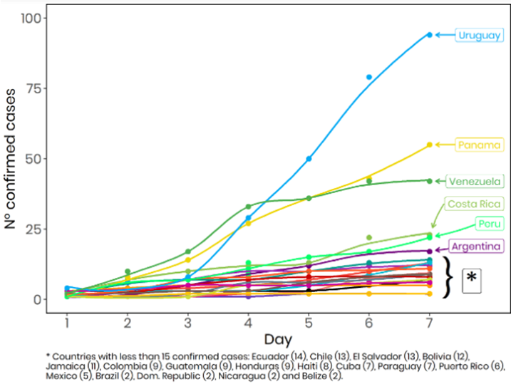 Análisis comparativo a una semana de iniciada la pandemia en cada país. Kasmera. 2020;48(1):e48131621.