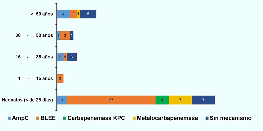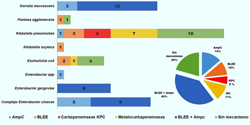 Klebsiella pneumoniae (34,3 %), complejo Enterobacter cloacae (19,2 %), Serratia