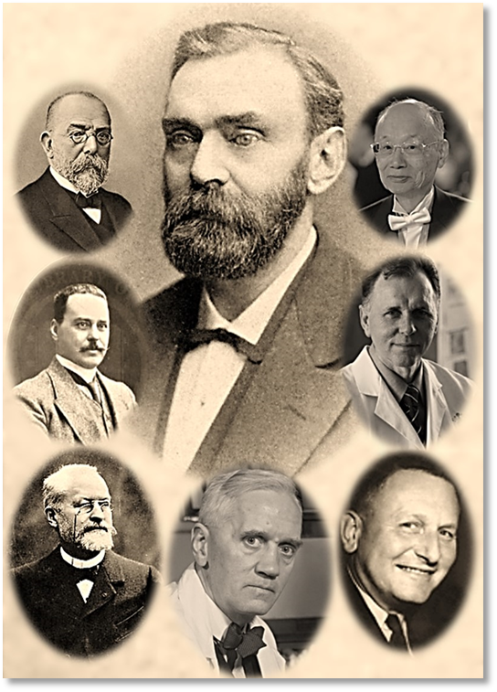 Figura 1. Al fondo Alfred Nobel. De izquierda a derecha, Robert Koch, Ronald Ross, Louis Laveran, Alexander Fleming, Paul Müller, Barry Marshall y Satoshi Ōmura. Composición fotográfica del autor.