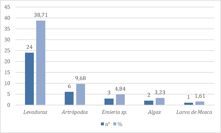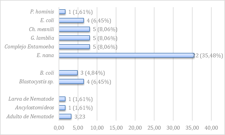 parasitaria. Las especies más frecuentes fueron: Endolimax nana con 22 casos (35,48%) y complejo Entamoeba, Giardia lamblia y Chilomaxtix