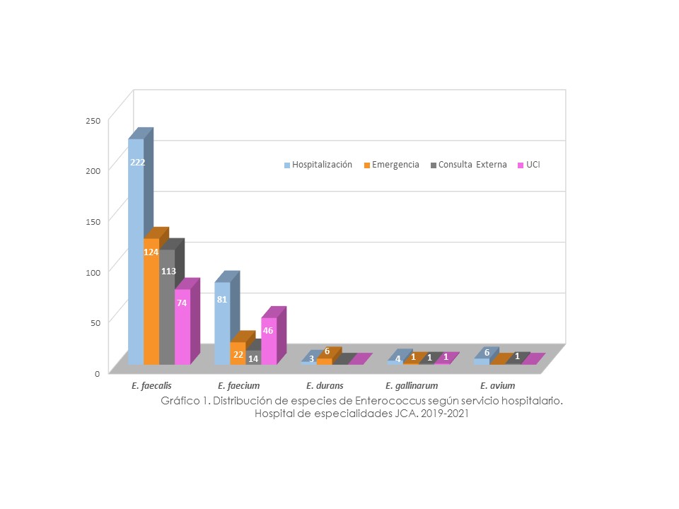 2021. La especie más frecuente fue E. faecalis (73,9%), E. faecium (22,6%), otras especies (3,22%). Se observó diferencia significativa para E. faecalis (p< 0,05). El mayor número de cepas provenía de hospitalización (44%), emergencia