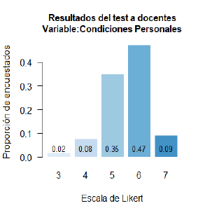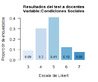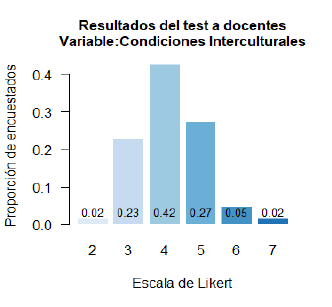 En relación a los hallazgos encontrados acerca de la visión de los docentes para estas tres variables, se tiene que, en la variable de las condiciones sociales el 41% de los docentes encuestados se autocalifican con 5 en la escala de Likert; el 42% con 4, respecto a las condiciones interculturales; y el 47% se autocalifica con 6, en cuanto a las condiciones personales. Estos resultados permiten analizar, que es necesario generar una oferta de concientización y capacitación a docentes, en mayor medida en temas que permitan fortalecer su trabajo respecto a la aceptación de las condiciones culturales de los estudiantes, aunque no se puede dejar de lado un análisis respecto a la aceptación de las condiciones sociales y personales, siendo la Tabla 1, una referencia para definir las categorías que agrupan las diferentes condiciones descritas.