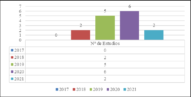 La estadística corresponde a los estudios seleccionados por el metaanálisis y siguiendo los criterios de inclusión y exclusión, con el fin de conocer el año con mayor frecuencia de publicaciones realizadas, tal como se aprecia en el Gráfico III.