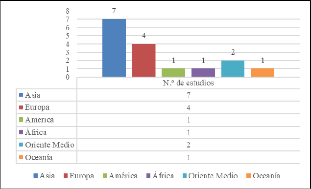 Al igual que los años, la región con mayor cantidad de publicaciones también cuenta con su histograma, tal y como se puede observar en el Gráfico IV. Así, la región con mayor cantidad de publicaciones, respetando los criterios de inclusión y exclusión fue la asiática.