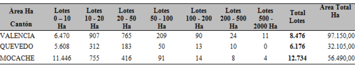 La estructura de la tenencia de la tierra rural en los cantones Valencia, Quevedo y Mocache, de acuerdo al número de lotes dentro de las diferentes categorías de superficie por ha, se presentan en la Tabla 4.