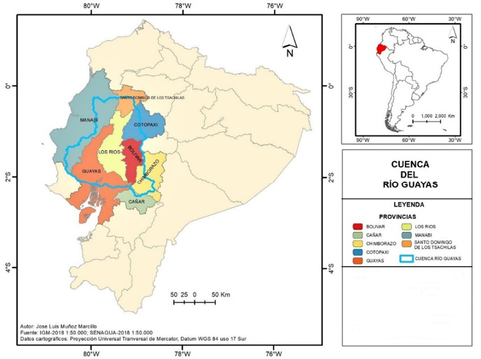 En ese sentido, la cuenca del río Guayas, se extiende entre los paralelos 00º 14’ S, 02º 27’ S y los meridianos 78º 36’ W, 80º 36’ W, abarcando territorios parciales o totales de ocho de las veinticuatro provincias ecuatorianas: Guayas, Los Ríos, Manabí, Santo Domingo de los Tsáchilas, Cotopaxi, Bolívar, Chimborazo, y Cañar. A su vez, las provincias de Guayas y Los Ríos, representan juntas el 48% de la superficie de la cuenca y el 72% de su población. El área total cubre aproximadamente 32.219 km2 (ver Figura I).