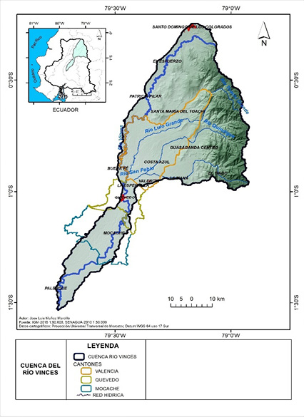 Las problemáticas complejas de degradación de un recurso fundamental para el desarrollo del territorio, impulsan a proponer un análisis integrado de la situación del manejo de la cuenca del río Vinces, para cuyo efecto se tomó en cuenta la relación de escalas de comprensión y acción, con sus dificultades de integración. De esta manera, se aborda la escala de la cuenca del río Guayas por su extensión e importancia en términos productivos y demográficos para Ecuador. Finalmente, a escala local, la investigación se focalizó en torno a las localidades de los cantones Valencia, Quevedo y Mocache (situadas en la subcuenca del río Vinces), cuya ubicación estratégica permite individualizar diferentes realidades territoriales que describen la parte alta, media y baja de la cuenca del río Vinces, respectivamente.