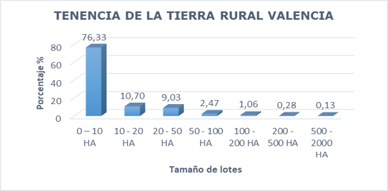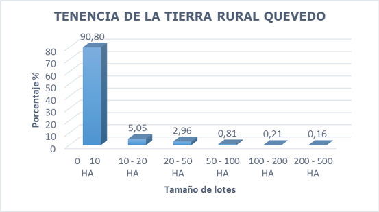 Asimismo, la estructura de la tenencia de la tierra rural en el cantón Valencia, Quevedo y Mocache, expresada en porcentajes en relación a las diferentes categorías de superficie correspondiente a la parte alta de la cuenca del rio Vinces, se presenta en el Gráfico IV. La Organización de las Naciones Unidas para la Alimentación y la Agricultura (FAO, 2008) sostiene que: “La tenencia de la tierra y los derechos de propiedad sobre ella resultan indispensables no sólo para el desarrollo económico y social sostenible y la mitigación de la pobreza, sino también para la gestión del riesgo” (p.4), así como de la disminución de los efectos en relación a los desastres naturales.