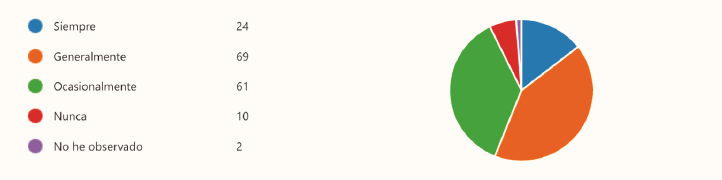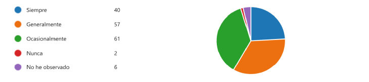 Los resultados del Gráfico II, muestran que, por un lado, un 41,6% (69 estudiantes), consideraron que generalmente terminan a tiempo las unidades del programa; por otro lado, un 36,8% (61 alumnos), mencionaron que ocasionalmente, y un 14,5% contestaron que siempre. Por lo tanto, la planeación de clase y tiempos es correcta por parte de los docentes de la asignatura, puesto que terminan los contenidos de manera adecuada en tiempo y forma.