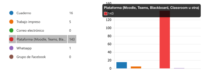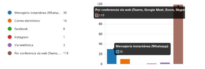 Por otra parte, los hallazgos plasmados en el Gráfico VIII, muestran que el medio más utilizado para el envío de tareas o actividades al profesor fue por video conferencia (Teams), con un 71,7% (119 estudiantes); seguido por la mensajería instantánea (WhatsApp) con el 18% de las respuestas (30 alumnos). En este apartado, se observa una comunicación correcta e institucional por parte de los docentes hacia los estudiantes de la asignatura.