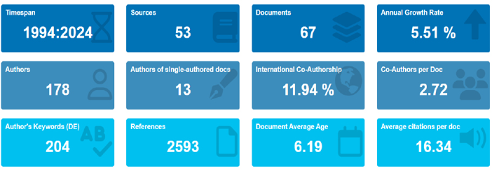 En el transcurso de la investigación, se empleó una revisión bibliográfica (De Pelekais et al., 2015), constituyendo un eslabón y herramienta dentro del proceso metodológico investigativo para facilitar la generación de conocimiento (Escorcia, 2008). Para ello, la ecuación o matriz de búsqueda fue: TITLE-ABS-KEY (“rural tourism”) AND TITLE-ABS-KEY (“tourist demand”) OR TITLE-ABS-KEY (“strategic planning”) OR TITLE-ABS-KEY (“Rural tourism demand”). Esta búsqueda arrojó 67 documentos relacionados con los temas de turismo rural y demanda del turismo rural, abarcando un período de tiempo desde 1994 hasta 2024 así como se evidencia en la Tabla 1 y Figura I.