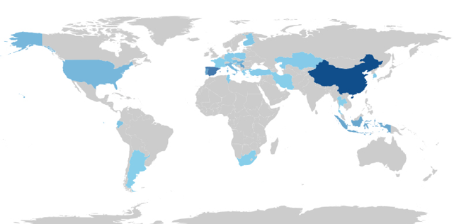 Por otra parte, se llevó a cabo un análisis geográfico para identificar los países que cuentan un mayor número de publicaciones científicas en materia del tema central de la investigación, donde destacan China, España, Serbia, Irán, Indonesia, Hungary, Italia y USA (ver Figura II). Estas naciones, representan el mayor número de publicaciones de todos los documentos analizados en este campo de estudio.