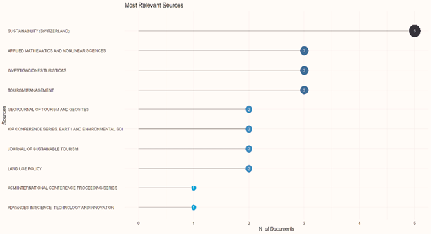 Así mismo, se efectuó un análisis de las fuentes más destacadas en el ámbito de la investigación. Donde se puede evidenciar que, cuatro (4) de las revistas con mayor número de publicaciones científicas en materia del tema de investigación son: Sustainability (Switzerland) (5), Applied Mathematics and Nonlinear Sciences (3), Investigaciones Turísticas (3), y Tourism Management (3) (ver Gráfico II).