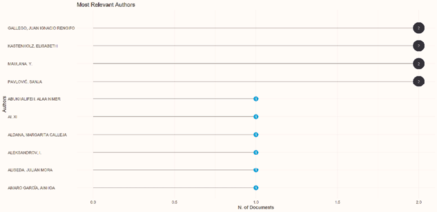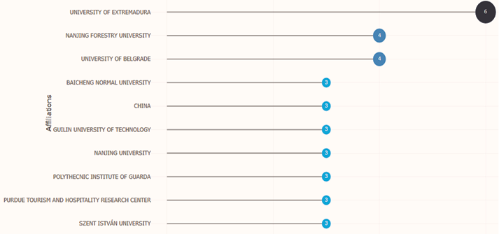 Con relación a la productividad por autor, esta se distribuye entre los que han publicado dos artículos, y el resto con una sola publicación en revistas Scopus. En este orden de ideas, se tiene que, entre las universidades que han desarrollado y publicado la mayor cantidad de estudios relacionados con el turismo rural y su demanda resaltan la University of Extremadura en España, Nanjing Forestry University en China, y University of Belgrade, en Serbia.