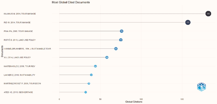 En este orden de ideas, se presenta el Gráfico V, con las publicaciones más citadas en el tema de estudio. Entre las cuatro (4) más representativas se encuentran las escritas por los autores: Kajanus M., 2004, Tour Manage, artículo científico titulado “The use of value focused thinking and the A’WOT hybrid method in tourism” (Kajanus, Kangas y Kurttila, 2004), con 182 citas; seguido de Rid W, 2014, Tour Manage titulado: “Segmentation by motivation for rural tourism activities in The Gambia” (Rid, Ezeuduji y Pröbstl-Haider, 2014), con 152 citas; Albaladejo I., 2005, Tour Manage con 76 citas titulado: “Rural tourism demand by type of accommodation” (Albaladejo y Díaz, 2005); y, Ristić D., 2019, Land Use Policy articulo científico llamado: “Tourism and sustainable development of rural settlements in protected areas - Example NP Кopaonik (Serbia)” (Ristić, Vukoičić y Milinčić, 2019), con 75 citas.
