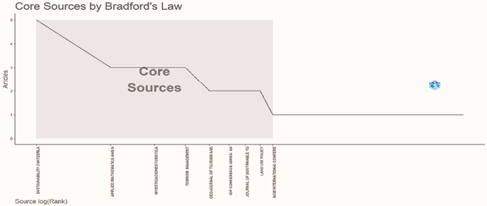 Al aplicar la ley de concentración o dispersión de la literatura (Ley de Bradford), se observa que el 34,33% de los artículos publicados se agrupan en las 9 principales revistas, las cuales se encuentran en la zona 1, es decir, las revistas con mayor producción científica. Entre estas, se destacan las 4 revistas principales, que, como se muestra en el Gráfico VI son: Sustainability (Switzerland), Applied Mathematics and Nonlinear Sciences, Investigaciones Turísticas, y Tourism Management, las mismas corresponden al 60,87% del total de publicaciones de las revistas que conforman la zona 1.