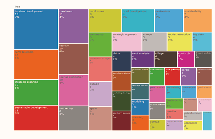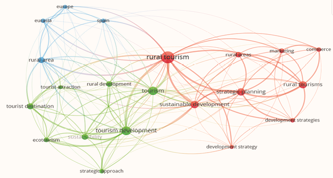 Por su parte, en el análisis de co-ocurrencia de palabras clave, se estableció como parámetro que una palabra clave debía tener al menos cinco (5) ocurrencias. De un total de 488 palabras clave analizadas, únicamente 21 cumplieron con este criterio. Este resultado se puede apreciar en las figuras adjuntas (ver Figura IV y V), las cuales muestran la identificación de clústeres destacados por las palabras: Rural tourism, tourism development, strategic planning, sustainable development.