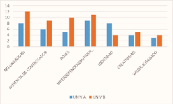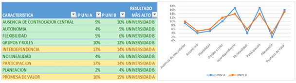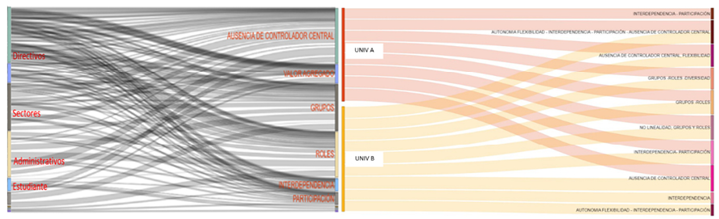 Las líneas muestran los tópicos de la auto organización con mayor frecuencia en el trabajo de campo, resultando más marcada la interdependencia y la participación, sin relaciones en la figura; la ausencia de controlador central, grupos y roles tienen leves inclinaciones con sectores, administrativos y estudiantes; mientras que valor agregado presenta leve interconexión con administrativo. La intercepción de las características entre universidades arroja nueve conexiones en la universidad B y ocho en la universidad A. Para dar consistencia al resultado se realizó un análisis comparativo porcentual independiente, evitando errores por desviación, en congruencia con los valores absolutos obtenidos del software Atlas Ti (ver Figura IV).