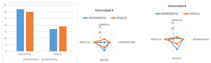 En un mismo espacio y tiempo se realizó un ejercicio de simulación de cinco corridas, con duración de 100.000 puntos de proyección, cuyos resultados se promediaron para reducir los márgenes de error y se analizaron en Excel. El resultado demuestra que la universidad A de estructura piramidal, generó inicialmente 3 ideas; mientras que la universidad B auto organizada genera 4; las interacciones de sus agentes en la universidad A generaron 32 ideas compartidas y 20 innovaciones, en comparación con las 321 ideas compartidas y 130 innovaciones de la universidad B.