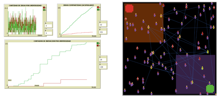 La simulación que se proyecta representa las interacciones entre los agentes que pueden generar innovaciones en la Universidad, conformados por estudiantes, profesores, directivos, administrativos, externos. Ambas universidades cuentan con el mismo generador de ideas basado en las pilas de arena que actúa como un acumulador de pequeñas acciones para generar grandes cambios. Este aspecto permite demostrar el comportamiento aleatorio no programado con interacciones variadas en cada corrida y la no prevalencia de ninguna de las dos universidades. Es así como las interacciones (enlaces) entre los agentes permiten evidenciar el recorrido de una idea desde que se genera hasta que se convierte en innovación o es descartada (ver Figura VI).
