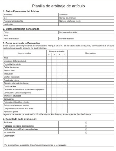 FASE 2: Revisión externa, en un plazo de cuatro (4) semanas, mediante la inclusión de dos pares externos a la Universidad del Zulia (nacionales o internacionales), como evaluadores del artículo bajo la modalidad doble ciego, y en caso de presentarse desacuerdo en la evaluación, se asignará un tercer evaluador para dirimir los desacuerdos. Estos especialistas califiacarán el articulo en escala de: E = Excelente; B = Bueno; A = Aceptable; D = Deficiente, asi mismo se realizarán observaciones y emitirán un concepto en términos de: publicable, publicable con ligeras modificaciones, publicables con modificaciones sustanciales o no publicable.