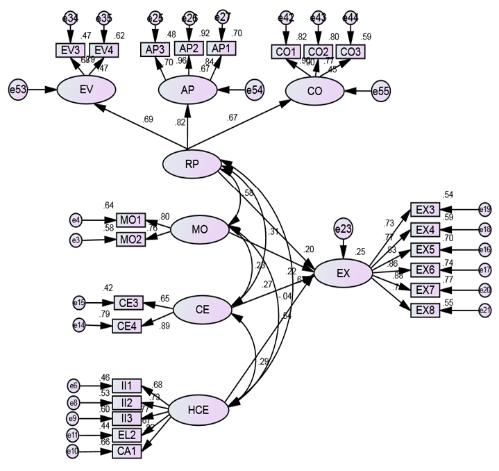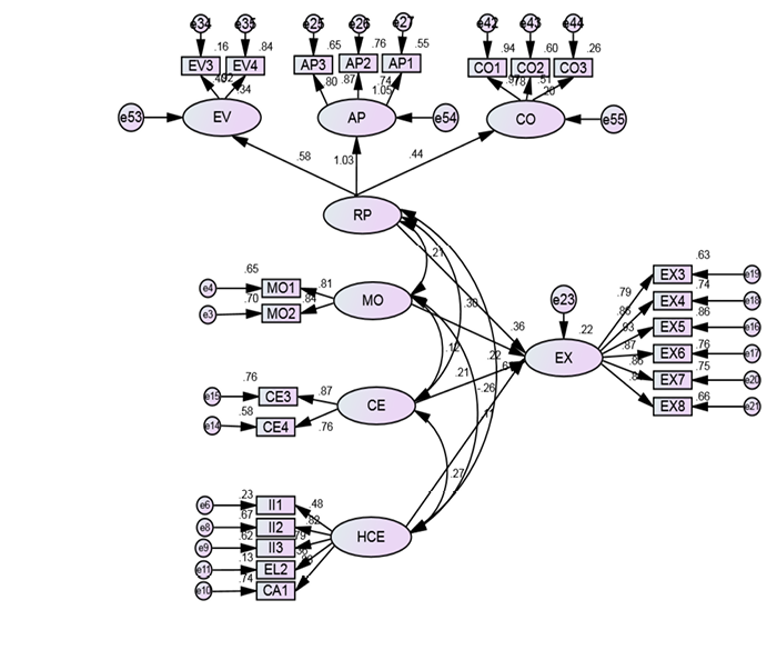 La validez interna consiste en evaluar la validez de cada variable inmersa en el trabajo, en este sentido se obtuvieron los pesos de regresión estandarizados por medio del análisis factorial confirmatorio (CFA), en esta etapa se eliminan los ítems con cargas factoriales menores a 0.5 (Hair, et al, 2010), resultando afectadas dos dimensiones de los cinco grandes rasgos de la personalidad que fueron agradabilidad y estabilidad emocional, por lo que fueron eliminadas.