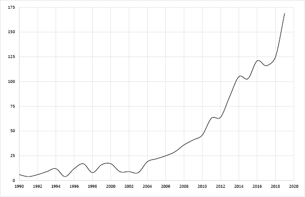 El número de artículos por año durante el período analizado, 1990-2019, se ha incrementado, especialmente, en los últimos cinco años, con 634 artículos, que representando el 48,55% del total de las contribuciones sobre esta temática. En el último año analizado, 2019, se publicaron 169 artículos (12,94%) en 13 idiomas diferentes, con 1.283 en inglés (98,24%).
