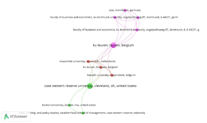 El grupo 2 (color verde) está encabezado por Case Western Reserve University, (Cleveland, Estados Unidos), y se asocia con Boston University (Boston, Estados Unidos) y el Department of Marketing and Policy Studies, de Weatherhead School of Management - Case Western Reserve University (Cleveland, Estados Unidos). Por último, el grupo 3 (color rojo) está liderado por Hasselt University (Diepenbeek, Bélgica), se asocia con Ku Leuven (Brussels, Bélgica), y Maastricht University (Maastricht, Países Bajos), gráfico 3.